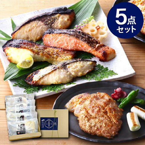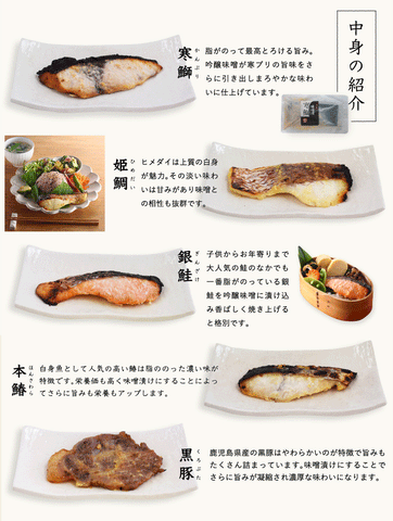 名称:吟醸味噌漬け5種(黒豚・寒鰤・姫鯛・銀鮭・本鰆)