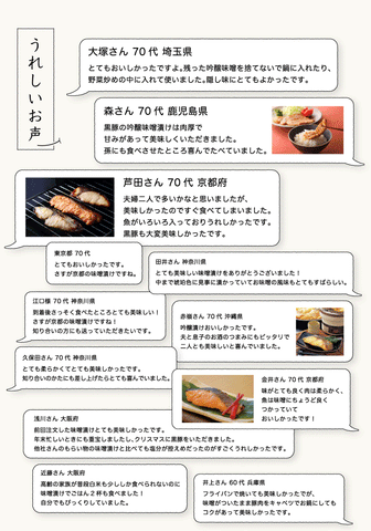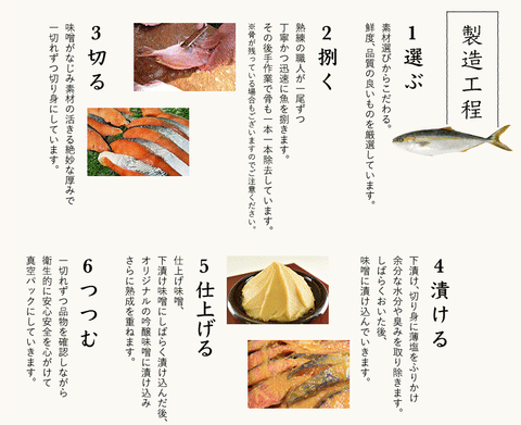 内容量:黒豚(100g)、寒鰤(80g)、姫鯛(80g)、銀鮭(80g)、本鰆(80g)