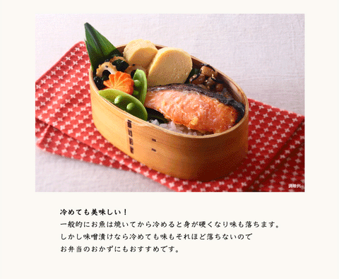 一般的にお魚は焼いてから身が冷めると硬くなり味も落ちますが、味噌漬けなら冷めても味も落ちにくいのでお弁当などの一品に最適です。