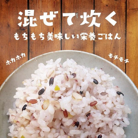 原材料名:胚芽押麦(国産)、もち黒米、押裸麦、大豆、小豆、大豆金時豆、もちきび、発芽玄米、高きび、インゲン豆、黒大豆、もち赤米、もち粟、青大豆、ひえ、アマランサス