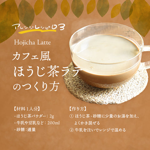 製菓用として、ケーキなどのスイーツやお菓子はもちろん、牛乳や豆乳と混ぜてほうじ茶ラテにするなど、ほうじ茶ドリンクにもお使いいただけます。