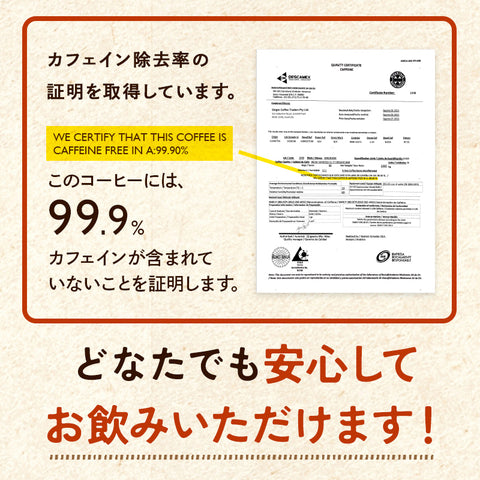 オーガニックコーヒー専用の焙煎機で焙煎し、化学薬品を使っていないので安全性が高く、 99.9%のカフェインを除去しています。妊娠中、授乳中でもコーヒーを飲みたい方も安心!