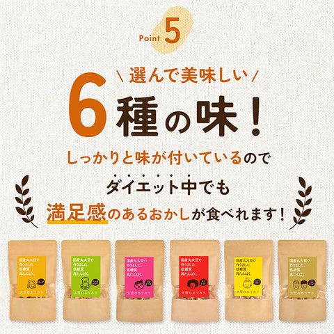 そんな大豆を使用したお菓子で食物繊維たっぷり。グルテンフリーの低糖質(糖質オフ)・高タンパクのお菓子で、美味しくすっきりをサポートします。