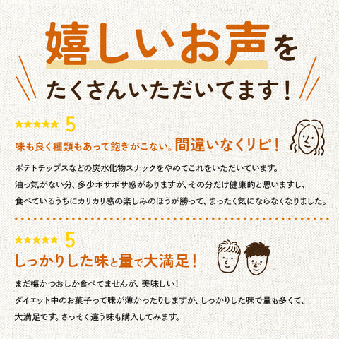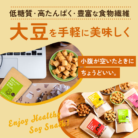 そんな大豆を使用したお菓子で食物繊維たっぷり。グルテンフリーの低糖質(糖質オフ)・高タンパクのお菓子で、美味しくすっきりをサポートします。
