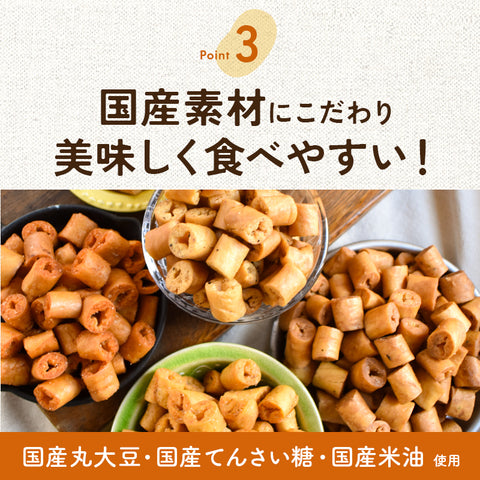 大豆の形状を「ロール型」にすることにより、サクサク感がアップし食感が良く食べやすくなりました。
