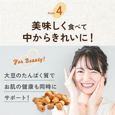 そんなイソフラボンを多く含む大豆を使用したお菓子で、みずみずしくきめ細やかなお肌の状態を整えます。