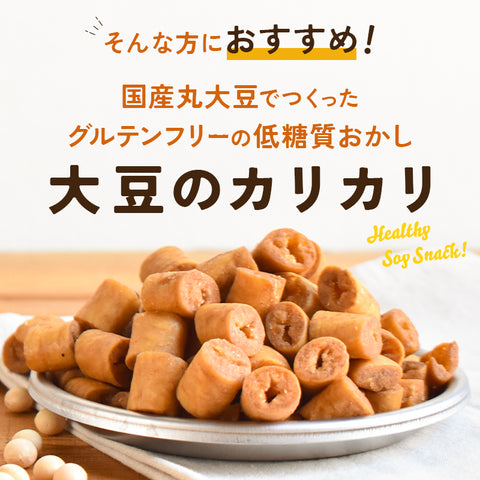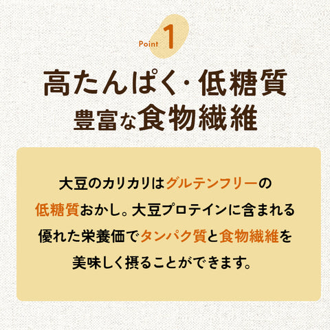 そんな大豆を使用したお菓子で食物繊維たっぷり。グルテンフリーの低糖質(糖質オフ)・高タンパクのお菓子で、美味しくすっきりをサポートします。