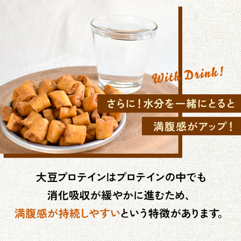 大豆プロテインはプロテインの中でも消化吸収が緩やかに進むため、満腹感が持続しやすいという特徴があります。