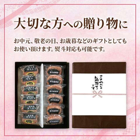 黒豚ハンバーグ80g×6個、黒毛和牛・黒豚のミックスハンバーグ80g×6個の合計12個入り。