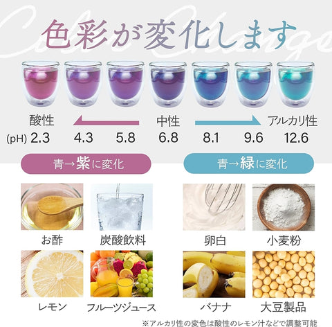 紫色、ピンク色など、色合いが魔法のように変化する食用色素です。
