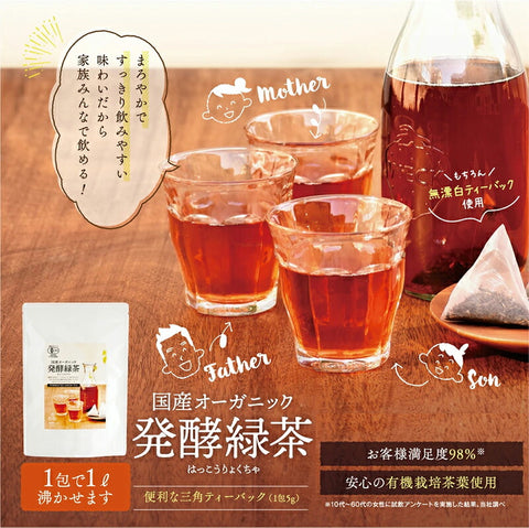 微生物発酵と香味発酵のWで発酵国産するこのオーガニック発酵緑茶は、美容と健康のために毎日美味しく安心して飲めるように「無漂白ティーバッグ(抽出しやすい三角形)」を使用しています。