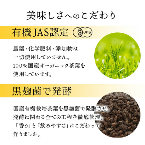 国内流通わずか3.4%という希少な有機茶葉を使用し、 泡盛や焼酎の発酵に使用される黒麹菌という微生物によって発酵させ作られる国産オーガニック発酵緑茶、無理なく続けられることが大事なので