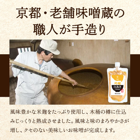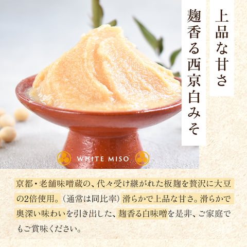 味噌づくり一筋、現代の名工にも選ばれた職人が手造りした白味噌は京都の料亭でも愛され続ける逸品です。代々受け継がれた板麹をふんだんに使用し、滑らかで奥深い味わいを引き出した、麹香る白味噌を是非、ご家庭でもご賞味ください。