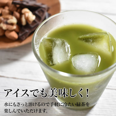 お湯と混ぜて飲むだけでなく、ペットボトルの水と混ぜて飲んだり、お酒の水割りに粉末緑茶を少量足していただくだけで、お茶割りが簡単にできます。